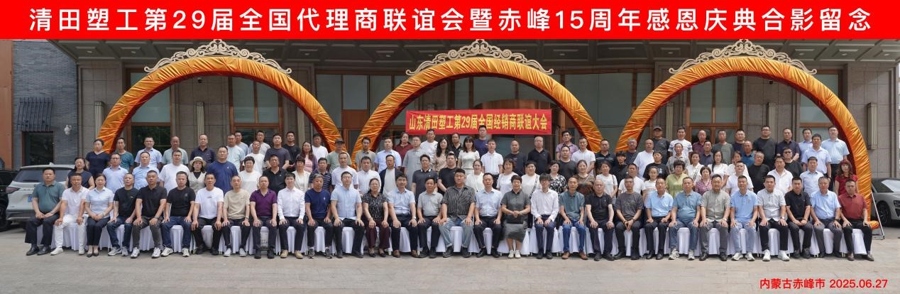 2025年6月27日,山東清田塑工有限公司在內(nèi)蒙古赤峰市盛大舉辦第29屆全國代理商聯(lián)誼會(huì)暨赤峰15周年感恩慶典活動(dòng),活動(dòng)現(xiàn)場(chǎng)高朋滿座,來自全國各地的經(jīng)銷商代表、生產(chǎn)設(shè)備供應(yīng)商及原料供應(yīng)商等產(chǎn)業(yè)鏈伙伴齊聚一堂,共襄盛舉。
